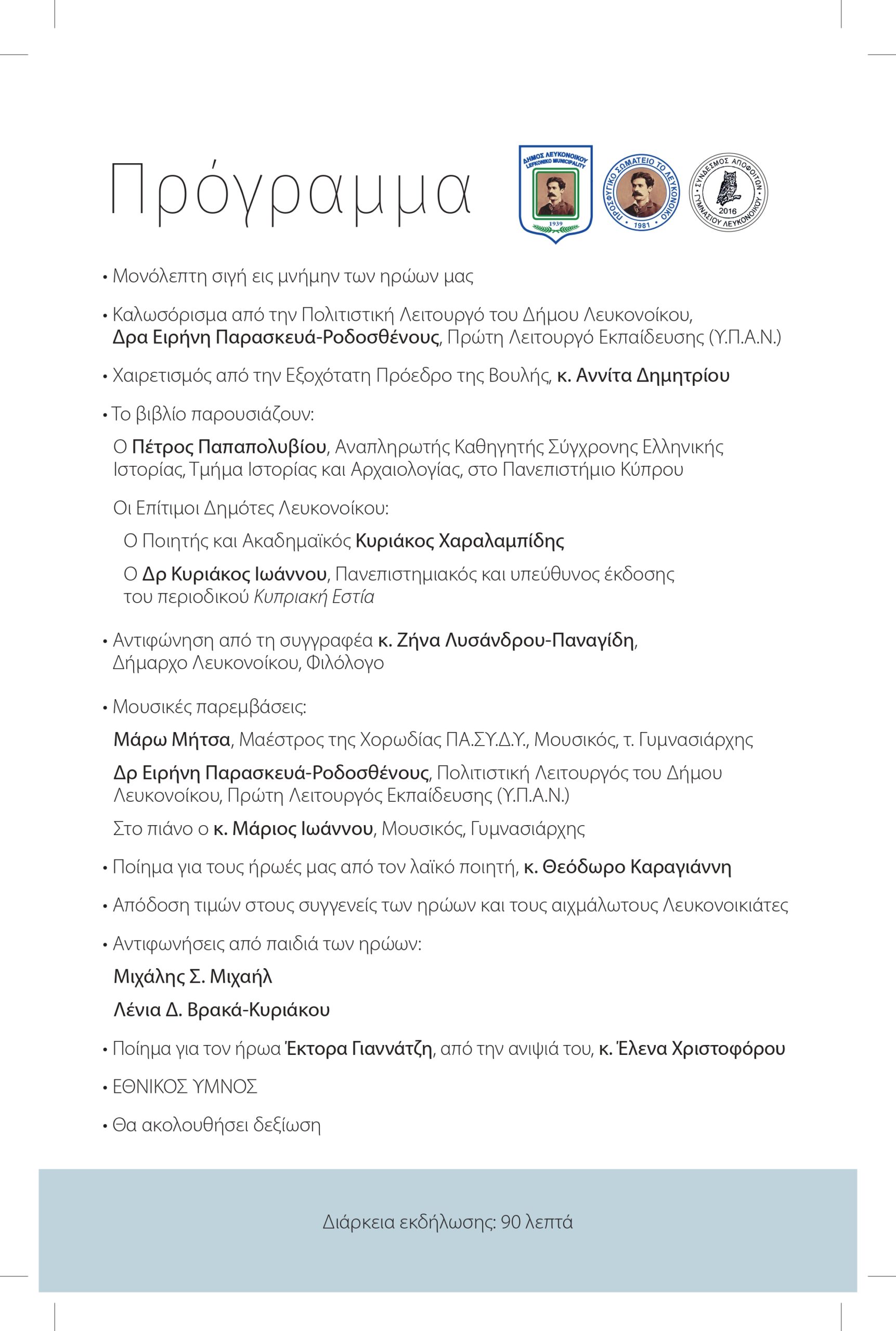 - Το βιβλίο παρουσιάζουν: Ο Πέτρος Παπαπολυβίου, Αναπληρωτής Καθηγητής Σύγχρονης Ελληνικής Ιστορίας, Τμήμα Ιστορίας και Αρχαιολογίας, στο Πανεπιστήμιο Κύπρου. Οι Επίτιμοι Δημότες Λευκονοίκου: Ο Ποιητής και Ακαδημαϊκός Κυριάκος Χαραλαμπίδης, Ο Δρ Κυριάκος Ιωάννου, Πανεπιστημιακός και υπεύθυνος έκδοσης του περιοδικού Κυπριακή Εστία