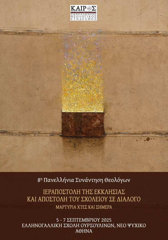 Ο Θεολογικός Σύνδεσμος «ΚΑΙΡΟΣ» διοργανώνει την 8η Πανελλήνια Συνάντηση Θεολόγων με θέμα “H Ιεραποστολή της εκκλησίας και η αποστολή του σχολείου σε διάλογο. Μαρτυρία χτες και σήμερα”, το διάστημα 5-7 Σεπτεμβρίου 2025, στην Ελληνογαλλική σχολή Ουρσουλινών, Νέο Ψυχικό, Αθήνα. Στη Συνάντηση Θεολόγων επιχειρείται να διερευνηθούν άξονες της ιεραποστολής προσκαλώντας σε γόνιμο διάλογο και ανταλλαγή απόψεων αξιόλογους κληρικούς, πανεπιστημιακούς δασκάλους και μάχιμους εκπαιδευτικούς (θεολόγους και δασκάλους).