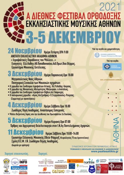 Το Α’ Διεθνές Φεστιβάλ Ορθόδοξης Εκκλησιαστικής Μουσικής Αθηνών είναι γεγονός και θα λάβει χώρα στην Αθήνα από 3-5 Δεκεμβρίου 2021, υπό την Αιγίδα του ΥΠ.ΠΟ.Α, του Δήμου Αθηναίων και της Ιεράς Αρχιεπισκοπής Αθηνών. H πόλη της Αθήνας θα αποτελεί και τη μόνιμη έδρα διεξαγωγής του, καλύπτοντας ένα μεγάλο κενό στα πολιτιστικά δρώμενα της πόλης.