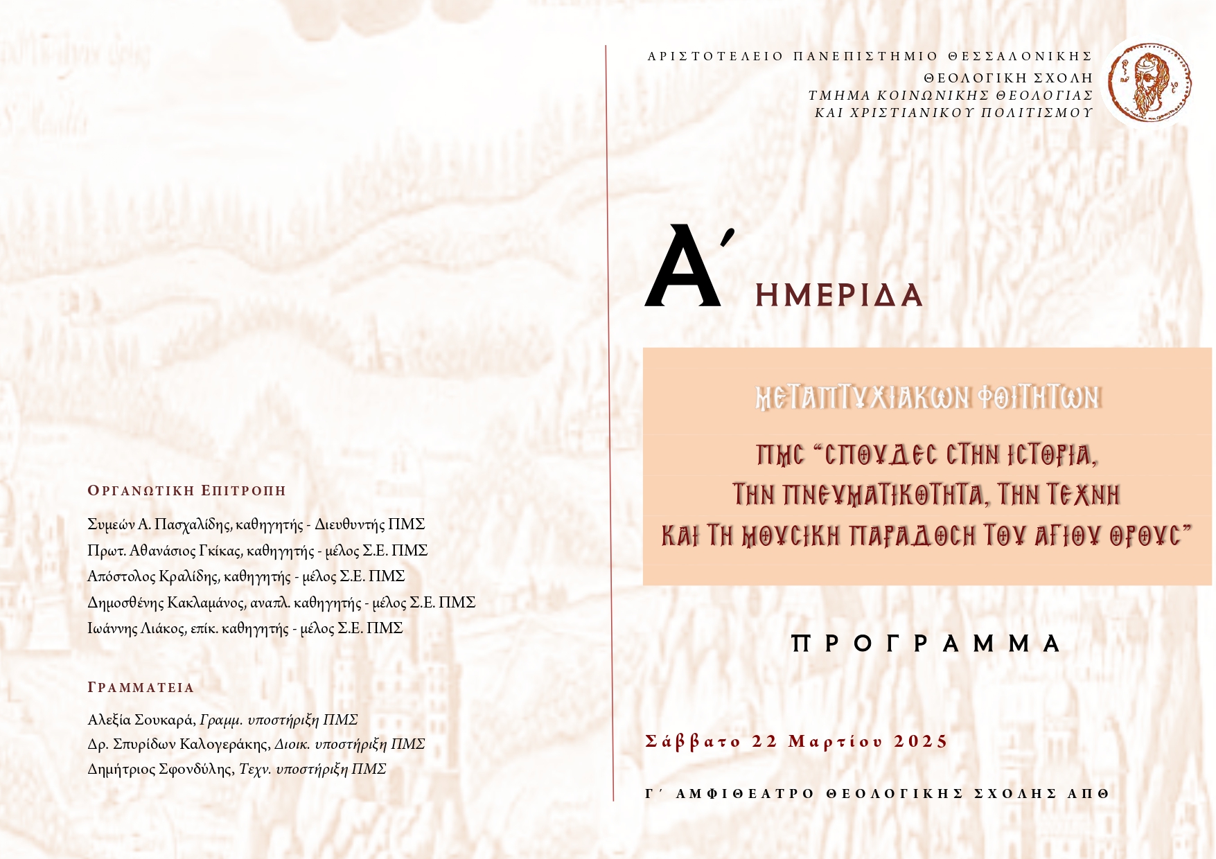 Το Σάββατο 22 Μαρτίου 2025 (ώρα 9 π.μ.-12.30 μ.μ.) στο Γ´ Αμφιθέατρο της Θεολογικής Σχολής του ΑΠΘ, θα λάβει χώρα η Α´ Ημερίδα Μεταπτυχιακών Φοιτητών του Προγράμματος Μεταπτυχιακών Σπουδών (ΠΜΣ): “Σπουδές στην Ιστορία, την Πνευματικότητα, την Τέχνη και την Μουσική Παράδοση του Αγίου Όρους”, του Τμήματος Κοινωνικής Θεολογίας και Χριστιανικού Πολιτισμού.
