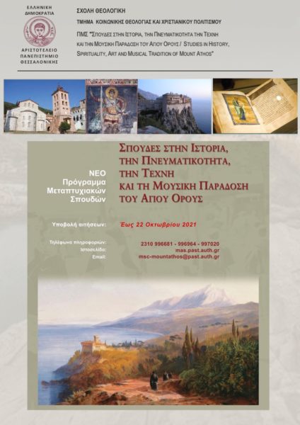 Το εξαιρετικά ενδιαφέρον Πρόγραμμα Μεταπτυχιακών Σπουδών, με τίτλο «Σπουδές στην Ιστορία, την Πνευματικότητα, την Τέχνη και τη Μουσική Παράδοση του Αγίου Όρους», του Τμήματος Κοινωνικής Θεολογίας και Χριστιανικού Πολιτισμού της Θεολογικής Σχολής του Α.Π.Θ., λειτουργεί για τέταρτη συνεχόμενη χρονιά, λαμβάνοντας υπόψη το ολοένα αυξανόμενο ενδιαφέρον πολλών Ελλήνων και ξένων επιστημόνων για τα θέματα της αγιορειτικής ιστορίας και πνευματικότητος, καθώς και της ιδιαίτερης τέχνης και μουσικής παράδοσης του Αγίου Όρους.