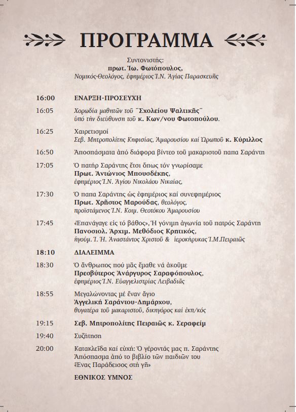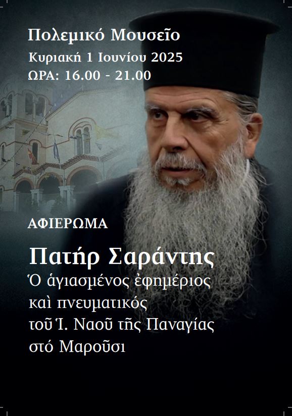 Με τίτλο «Πατήρ Σαράντης, ο αγιασμένος εφημέριος και πνευματικός του Ιερού Ναού της Παναγίας στο Μαρούσι» θα πραγματοποιηθεί αφιέρωμα στον μακαριστό πατέρα Σαράντη Σαράντo από την Εστία Πατερικών Μελετών, την Κυριακή 1 Ιουνίου και ώρα 4μ.μ, στο Πολεμικό Μουσείο.