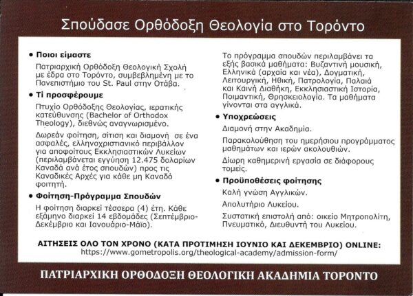 Πριν από είκοσι χρόνια, το 1998, ο Σεβασμιώτατος Μητροπολίτης Τορόντο κ. Σωτήριος, διαπιστώνοντας ότι «ο θερισμός πολύς οι δε εργάται ολίγοι», ίδρυσε Ορθόδοξη Θεολογική Ακαδημία στην έδρα της Μητροπόλεώς του, η οποία αναγνωρίσθηκε ως Πατριαρχική από τον Οικουμενικό Πατριάρχη το 2017.