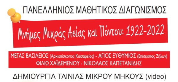 Το Υπουργείο Παιδείας και Θρησκευμάτων ανακοίνωσε τα αποτελέσματα του πανελλήνιου μαθητικού διαγωνισμού δημιουργίας ταινίας μικρού μήκους με θέμα: «Μνήμες Μικράς Ασίας–Πόντου: 1922-2022», που διοργανώθηκε από τη Γενική Γραμματεία Θρησκευμάτων του Υπουργείου Παιδείας και Θρησκευμάτων σε συνεργασία με την Ειδική Επιτροπή Πολιτιστικής Ταυτότητας της Ιεράς Συνόδου της Εκκλησίας της Ελλάδος, στο πλαίσιο της συμπλήρωσης των 100 ετών από τη Μικρασιατική τραγωδία.