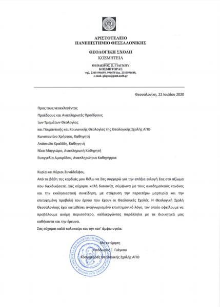 Με επιστολή του ο Κοσμήτορας της Σχολής, Καθηγητής κ. Θεόδωρος Γιάγκου, ευχήθηκε στους νεοεκλεγέντες Προέδρους και Αναπληρωτές Προέδρους καλή διακονία με στόχευση την περαιτέρω μαρτυρία και την επιτυχημένη προβολή του έργου που έχουν οι Θεολογικές Σχολές.
