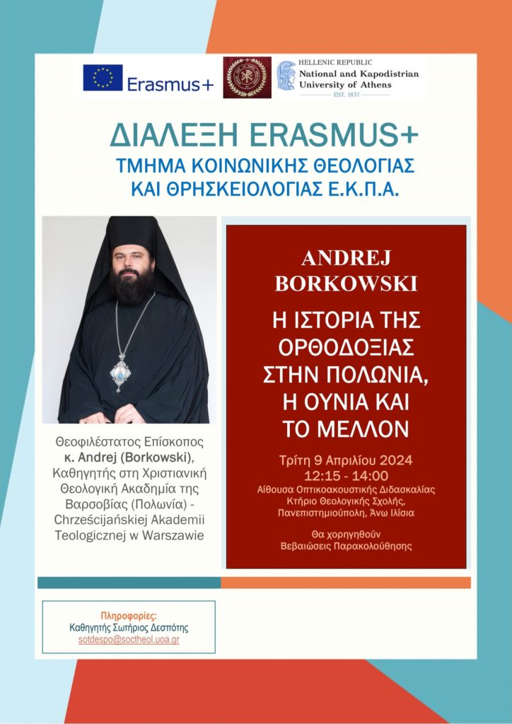 Στο πλαίσιο του ευρωπαϊκού προγράμματος ERASMUS+ του Εθνικού και Καποδιστριακού Πανεπιστημίου Αθηνών (Ε.Κ.Π.Α.) και του Τμήματος Κοινωνικής Θεολογίας και Θρησκειολογίας, θα πραγματοποιηθεί την Τρίτη 9 Απριλίου 2024 και ώρα 12:15 διάλεξη με θέμα: “Η ιστορία της Ορθοδοξίας στην Πολωνία, η ουνία και το μέλλον”.