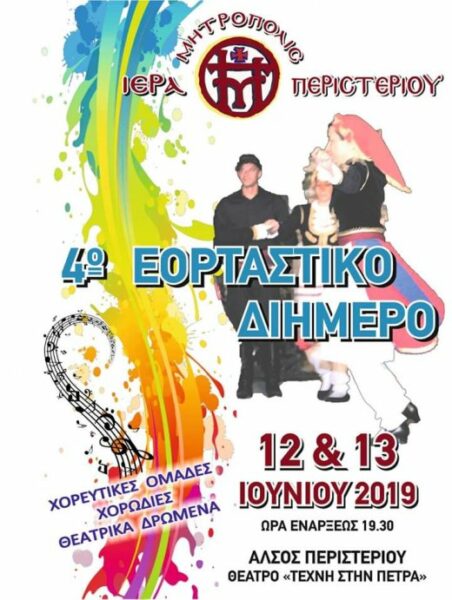 Η Ιερά Μητρόπολις Περιστερίου με τις ευχές και ευλογίες του Σεβασμιωτάτου Μητροπολίτου Περιστερίου κ. Κλήμεντος διοργανώνει Διήμερο Πολιτιστικό Φεστιβάλ Χορών και Χορωδιών στις 12 και 13 Ιουνίου 2019 στο Άλσος Περιστερίου. Ώρα έναρξης 7:30μ.μ.