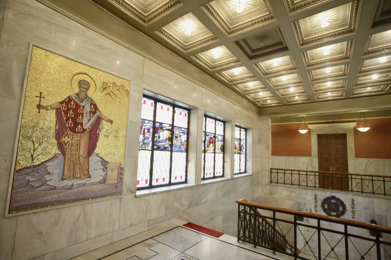 Στην κεντρική είσοδο του κτιρίου, ανεβαίνοντας τη μεγάλη σκάλα, δεξιά και αριστερά αποκαλύπτονται υπέροχες συνθέσεις σε βιτρό, που απεικονίζουν μύθους που συνδέονται με την Αθήνα και καλύπτουν μια έκταση περίπου 30τμ. Πρόκειται για νεότερα έργα που ανήκουν στον Τάκη Παρλαβάντζα, σύμφωνα με τα στοιχεία που έχει δώσει η κ. Αντωνοπούλου. Πολύ νεότερα έργα είναι και τα ψηφιδωτά του Βλάση Τσοτσώνη τα οποία και αυτά μιλούν για την Αθήνα. Στο ένα το θέμα είναι η θεά Αθηνά-Ειρήνη του Κόσμου και στο άλλο ο Άγιος Διονύσιος Αρεοπαγίτης, προστάτης και πολιούχος της πόλεως.