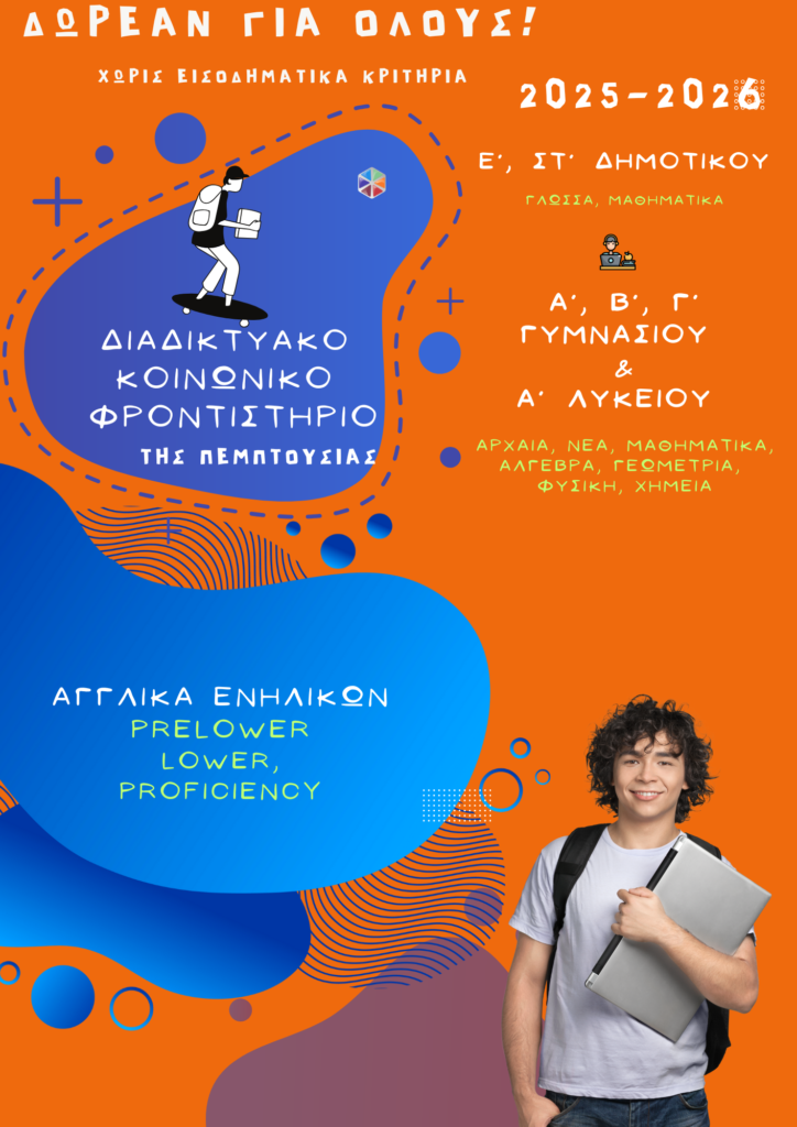 Δηλώστε τώρα ενδιαφέρον συμμετοχής μαθητών στο Διαδικτυακό Κοινωνικό Φροντιστήριο της Πεμπτουσίας για την νέα σχολική χρονιά 2025-2026. Ανοικτό για όλους, ΔΩΡΕΑΝ, χωρίς εισοδηματικά κριτήρια, θρησκευτικές η εθνικές καταβολές.