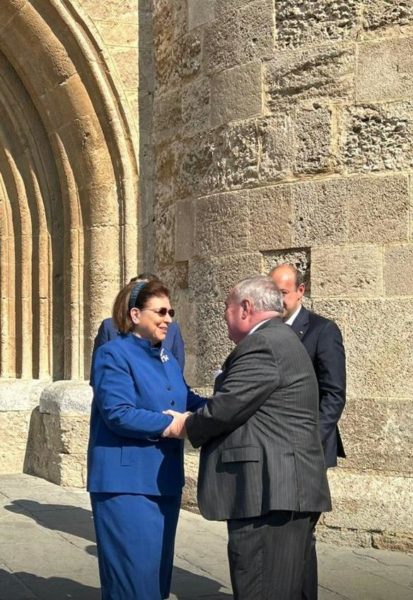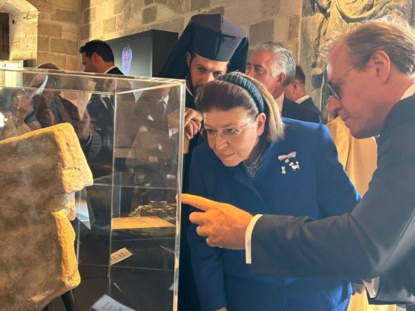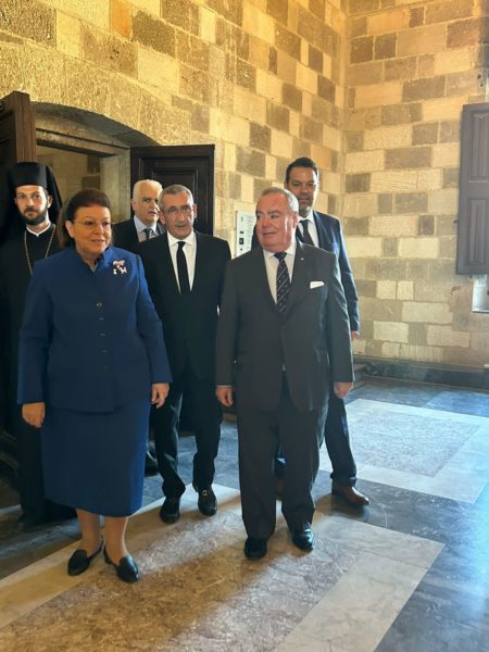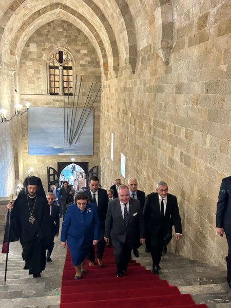 Η Υπουργός Πολιτισμού Λίνα Μενδώνη, ο Μέγας Μάγιστρος Fra’ John Dunlap, ο Θεοφιλέστατος Επίσκοπος Ολύμπου κ. Κύριλλος, ο Περιφερειάρχης Νοτίου Αιγαίου, ο Δήμαρχος Ρόδου