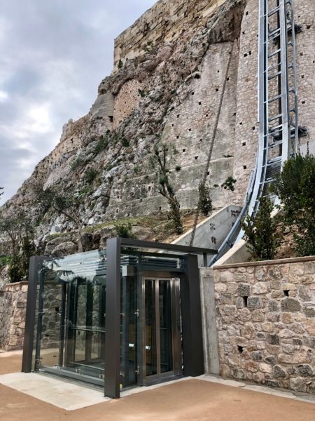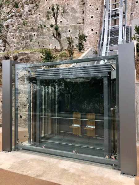 – Πρόκειται για ανελκυστήρα πλαγιάς μεταβλητής γωνίας, κατασκευή της ιταλικής εταιρείας MASPERO ELEVATORI. Η χωρητικότητά του είναι 1300 κιλά ωφέλιμο φορτίο, ήτοι, δύο αμαξίδια με δύο συνοδούς ή ένα φορείο ασθενοφόρου με έναν συνοδό. Η επιλογή του τύπου έγινε σύμφωνα με την τοπογραφία της περιοχής και τα γεωτεχνικά στοιχεία, βάσει των οποίων εκπονήθηκαν οι μελέτες κατασκευής του έργου. Έχει πιστοποιηθεί από τη διεθνή εταιρεία TUV, όπως ορίζουν οι Ευρωπαϊκοί Κανονισμοί σχετικά με τους ανελκυστήρες πλαγιάς. Σημειώνεται ότι ανάλογος ανελκυστήρας δεν υπάρχει σε άλλο μνημείο. Είναι ο μοναδικός παγκοσμίως επειδή κατασκευαστικά η μεταβλητή γωνία του πλησιάζει την ορθή, ενώ η περιμετρική γυάλινη επένδυσή του προσφέρει μοναδική πανοραμική θέα.