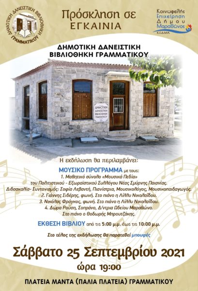 Η Δανειστική Βιβλιοθήκη Γραμματικού (ΚΕΔΜΑ), ένα μοναδικό δημιούργημα του Δήμου Μαραθώνα εγκαινιάζεται αυτό το Σάββατο 25 Σεπτεμβρίου 2021.