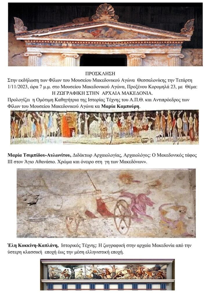 Την Τετάρτη 1 Νοεμβρίου 2023 στις 7 μ.μ. θα πραγματοποιηθεί στο Μουσείο Μακεδονικού Αγώνα (Προξένου Κορομηλά 23, Θεσσαλονίκη) εκδήλωση με θέμα η «Ζωγραφική στην Αρχαία Μακεδονία».