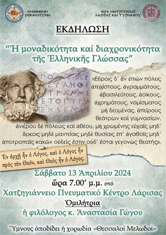 Το Σωματείο «ΕΝΩΜΕΝΗ ΡΩΜΗΟΣΥΝΗ» προσκαλεί στην εκδήλωση που διοργανώνει το Σάββατο 13 Απριλίου 2024 στις 19:00, στην αίθουσα του Χατζηγιάννειου Πνευματικού Κέντρου Λάρισας (Ρούσβελτ 57), με ομιλήτρια την φιλόλογο κ. Αναστασία Γώγου, με θέμα: «Η μοναδικότητα και διαχρονικότητα της Ελληνικής Γλώσσας».