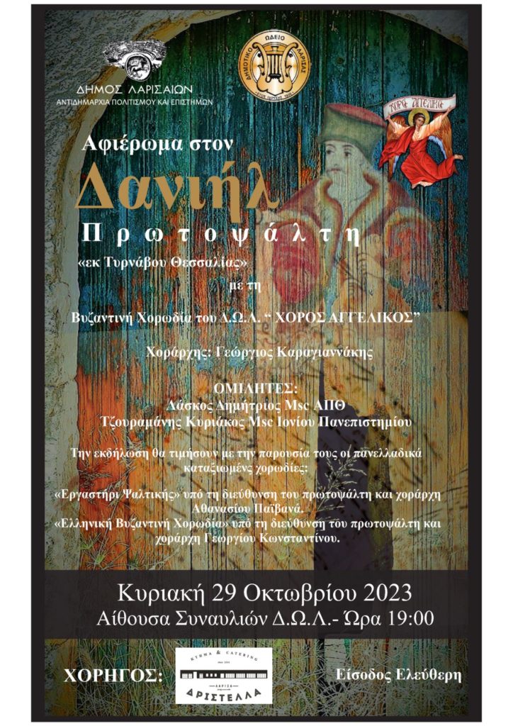 Το Δημοτικό Ωδείο Λάρισας και η Χορωδία Βυζαντινής Μουσικής του Δ.Ω.Λ. “ΧΟΡΟΣ ΑΓΓΕΛΙΚΟΣ” σας προσκαλεί στην ημερίδα που διοργανώνει την Κυριακή 29 Οκτωβρίου 2023 και ώρα 19.00 στην Αίθουσα Συναυλιών του ΔΩΛ, ως αφιέρωμα στον Δανιήλ Πρωτοψάλτη , εκ Τυρνάβου Θεσσαλίας.