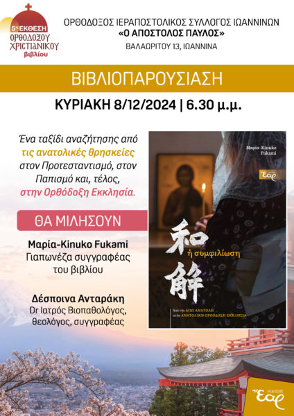 Στο πλαίσιο της 5ης Έκθεσης Ορθόδοξου Χριστιανικού Βιβλίου, οι Εκδόσεις Έαρ και ο Ορθόδοξος Ιεραποστολικός Σύλλογος «Απόστολος Παύλος» σε συνεργασία με το Βιβλιοπωλείο Δαμασκός πραγματοποίησαν εκδήλωση με αφορμή το βιβλίο της Μαρίας-Kinuko Fukami «Η συμφιλίωση» την Κυριακή 8 Δεκεμβρίου το απόγευμα, στην αίθουσα εκδηλώσεων του Ιεραποστολικού Συλλόγου «Απόστολος Παύλος» στα Ιωάννινα με πλήθος κόσμου και ιδιαίτερα ζεστό κλίμα.