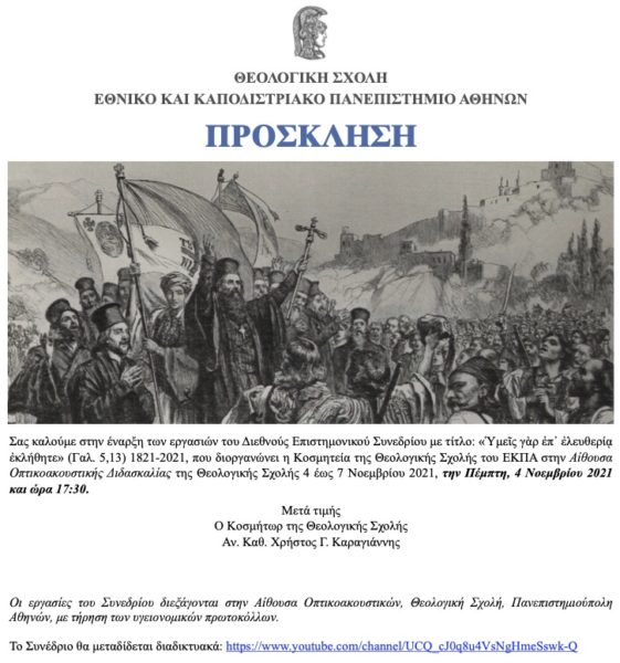 Διεθνές Επιστημονικό Συνέδριο με τίτλο «Ὑμεῖς γὰρ ἐπ’ ἐλευθερίᾳ ἐκλήθητε» (Γαλ. 5,13) 1821-2021 διοργανώνεται από 4 έως 7 Νοεμβρίου 2021 με πρωτοβουλία της Κοσμητείας της Θεολογικής Σχολής του Εθνικού και Καποδιστριακού Πανεπιστημίου Αθηνών (ΕΚΠΑ).