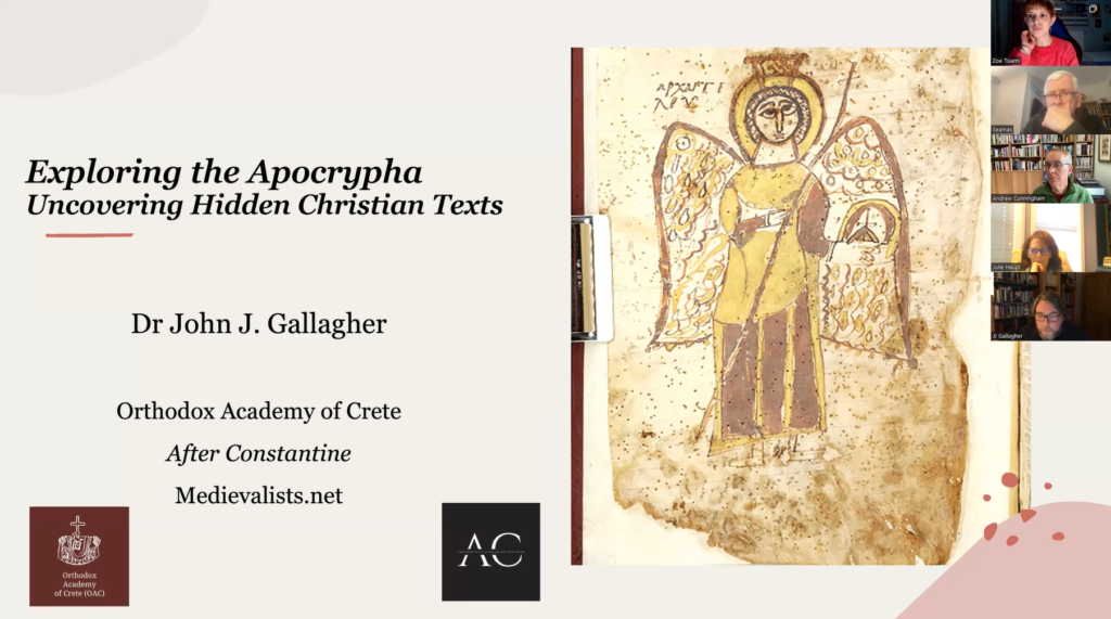 Με μεγάλη επιτυχία ολοκληρώθηκε το διεθνές διαδικτυακό Εργαστήρι, με θέμα την έρευνα πάνω στα απόκρυφα βιβλία και την ανακάλυψη νέων χριστιανικών κειμένων (Exploring the Apocrypha: Discovering Hidden Christian Texts), το οποίο πραγματοποιήθηκε την Κυριακή, 18 Φεβρουαρίου. Σκοπός του Εργαστηρίου ήταν η γνωριμία με τα απόκρυφα χριστιανικά κείμενα, η κοινωνική και θρησκευτική ερμηνεία τους, η παρουσίαση των λόγων που αποκλείστηκαν από τη Βίβλο και η διαδραστική μελέτη τους.