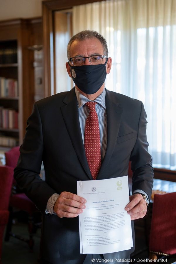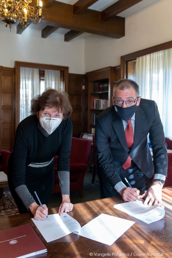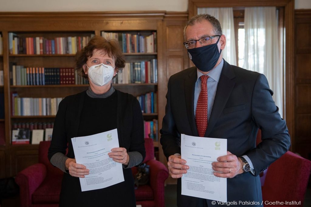Στο ιστορικό γραφείο της οικίας Μποδοσάκη όπου στεγάζονται οι υπηρεσίες του Ελληνικού Ιδρύματος Πολιτισμού συναντήθηκαν ο Πρόεδρος του Ελληνικού Ιδρύματος Πολιτισμού κ. Νίκος Α. Κούκης και η Διευθύντρια του Ινστιτούτου Γκαίτε Αθηνών κα Angela Kaya, όπου υπέγραψαν τριετές Σύμφωνο Συνεργασίας (Momerandum of Understanding) επικυρώνοντας θεσμικά το πλαίσιο σύμπραξης σε θέματα πολιτιστικού ενδιαφέροντος.