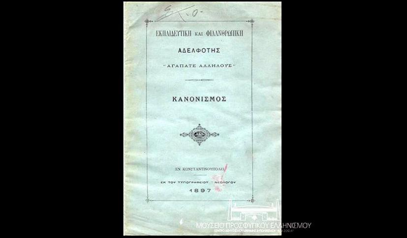 Η τελευταία προσθήκη για τις μελλοντικές προθήκες είναι ο Κανονισμός της Εκπαιδευτικής και Φιλανθρωπικής Αδελφότητας «Αγαπάτε Αλλήλους» που ιδρύθηκε στην Κωνσταντινούπολη το 1880. Κατά το δεύτερο μισό του 19ου αιώνα έως και το 1922 τα μέλη των ελληνορθόδοξων κοινοτήτων της Μικράς Ασίας, της Κωνσταντινούπολης και της Ανατολικής Θράκης ανέπτυξαν πολυσχιδή σωματειακή δράση, ιδρύοντας συλλόγους εκπαιδευτικούς, φιλανθρωπικούς κτλ., μετά και τις οθωμανικές μεταρρυθμίσεις.