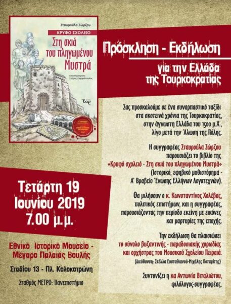 Η συγγραφέας Σταυρούλα Ζώρζου παρουσιάζει το βιβλίο της “Κρυφό σχολειό – Στη σκιά του πληγωμένου Μυστρά” (Ιστορικό, εφηβικό μυθιστόρημα, Α’ Βραβείο Ελλήνων Λογοτεχνών), κατά την Τετάρτη 19 Ιουνίου 2019 και ώρα 7.00 μ.μ. στο Εθνικό Ιστορικό Μουσείο – Μέγαρο Παλαιάς Βουλής.