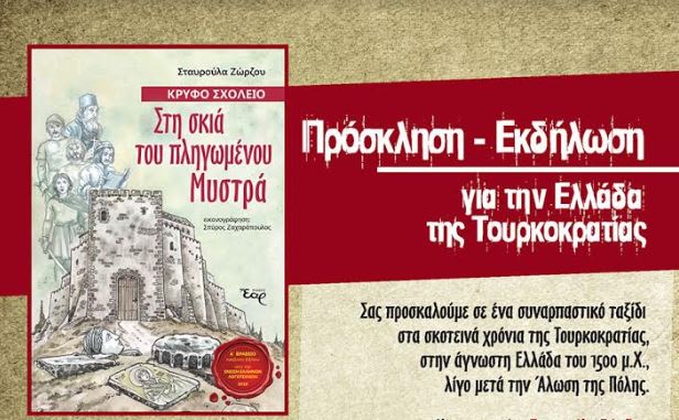 Η συγγραφέας Σταυρούλα Ζώρζου παρουσιάζει το βιβλίο της “Κρυφό σχολειό – Στη σκιά του πληγωμένου Μυστρά” (Ιστορικό, εφηβικό μυθιστόρημα, Α’ Βραβείο Ελλήνων Λογοτεχνών), κατά την Τετάρτη 19 Ιουνίου 2019 και ώρα 7.00 μ.μ. στο Εθνικό Ιστορικό Μουσείο – Μέγαρο Παλαιάς Βουλής.