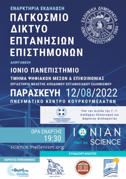 Η Γενική Γραμματεία Απόδημου Ελληνισμού και Δημόσιας Διπλωματίας του Υπουργείου Εξωτερικών έθεσε υπό την αιγίδα της την εκδήλωση για την έναρξη λειτουργίας του Παγκοσμίου Δικτύου Επτανησίων Επιστημόνων / Ionian Hall of Science, που έλαβε χώρα στην Κεφαλονιά, στο Πνευματικό Κέντρο Κουρκουμελάτων, την Παρασκευή 12 Αυγούστου 2022.