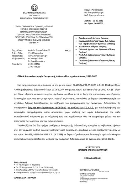 Την επαναλειτουργία της Ενισχυτικής Διδασκαλίας για το σχολικό έτος 2019 – 2020 μέχρι την Παρασκευή 12 Ιουνίου 2020 ανακοίνωσε το Υπουργείο Παιδείας με Δελτίο Τύπου. Η διδασκαλία θα γίνεται όπως αναφέρεται ρητά στο Δελτίο Τύπου που υπογράφει η Υφυπουργός Παιδείας, “λαμβάνοντας όλα τα απαραίτητα μέτρα για την προστασία των μαθητών και των εκπαιδευτικών”.