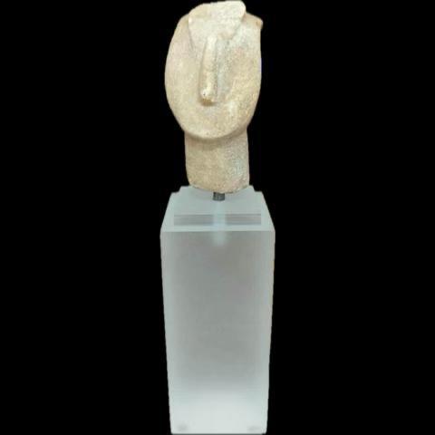 1. Μαρμάρινη κεφαλή Κυκλαδικού ειδωλίου. Ανήκει στον σπανιότερο τύπο του συμπλέγματος κατακόρυφης διάταξης. Στο μέσον του μετώπου διατηρούνται τα ίχνη των άκρων των ποδιών της μικρότερης μορφής η οποία πατούσε στην κεφαλή της μεγαλύτερης