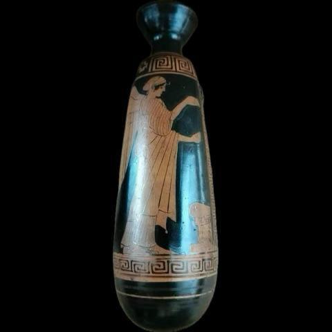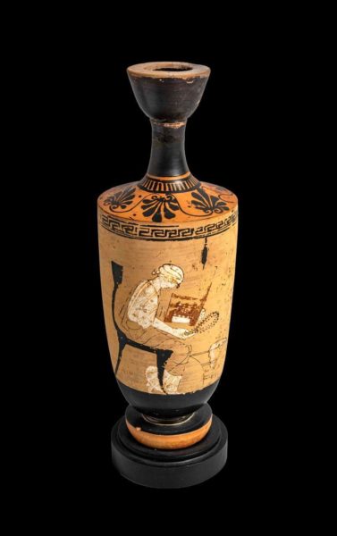 9. Αττική λήκυθος. Παριστάνεται καθισμένη σε κλισμό γυναικεία μορφή που κρατά κάτοπτρο και πυξίδα για κοσμήματα. Αποδίδεται στον «Ζωγράφο των Αθηνών 1826». Ύψος 22,9 εκ. Γύρω στα 460 π.Χ.