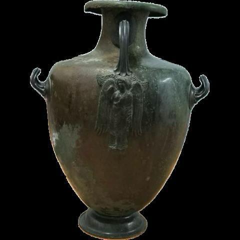 12. Χάλκινη τεφροδόχος υδρία. Στην κάτω πρόσφυση της κάθετης λαβής σφυρήλατη παράσταση της Νίκης προς τα αριστερά με ανοιχτές τις μακριές φτερούγες. Ύψος 48,26 εκ. Γύρω στα 350 π.Χ.