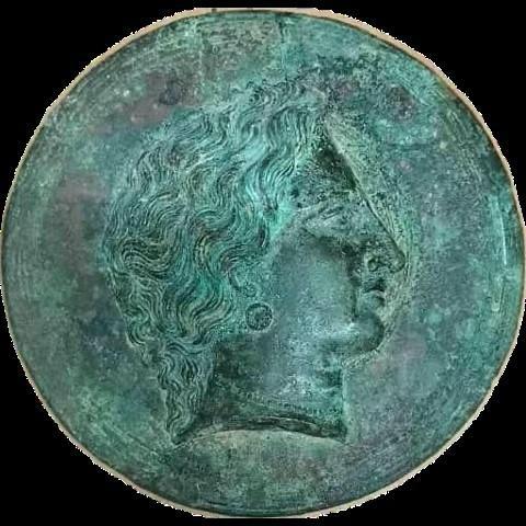 13. Χάλκινος δίσκος κατόπτρου. Φέρει στο κάλυμμα ανάγλυφη διακόσμηση γυναικείας κεφαλής σε κατατομή. Διάμετρος 15,20 εκ. Γύρω στα 270-260 π.Χ.