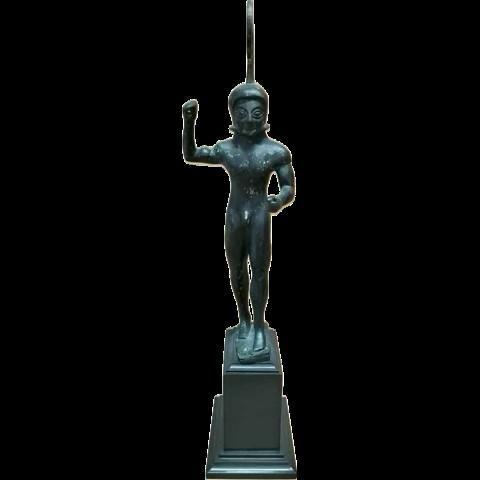4. Χάλκινο ειδώλιο οπλίτη. Ο νεαρός άνδρας παριστάνεται γυμνός. Φέρει στην κεφαλή κράνος με υψηλό λοφίο. Στο δεξί χέρι κρατούσε δόρυ και στο λυγισμένο αριστερό ασπίδα. Έργο λακωνικού εργαστηρίου. Ύψος 20,32 εκ. 600-550 π.Χ.