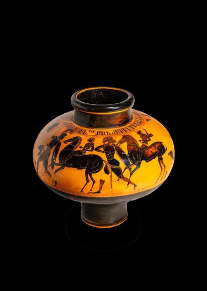 6. Αττικός μελανόμορφος ψυκτήρας (αγγείο που χρησιμοποιούταν για την ψύξη του κρασιού) με παράσταση ιππέων και οπλιτών. Ύψος 25,4 εκ. Γύρω στα 550 π.Χ.