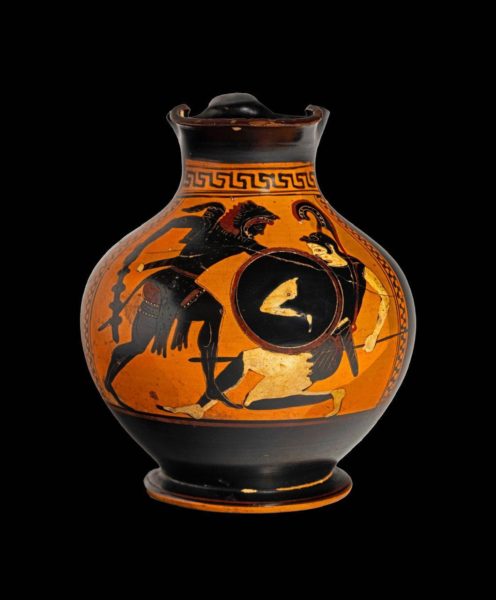 7. Αττικός μελανόμορφος χους με σκηνή μάχης ανάμεσα στον Ηρακλή και σε Αμαζόνα. Ο Ηρακλής επιτίθεται με ρόπαλο. Η αμυνόμενη Αμαζόνα φέρει κορινθιακό κράνος με υψηλό λοφίο και κρατά δόρυ και ασπίδα με ανθρώπινο σκέλος ως επίσημα. Ύψος 15,15 εκ. 550-500 π.Χ