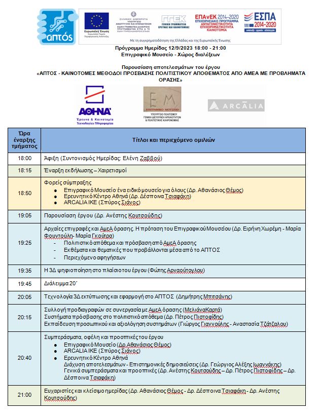 Ημερίδα παρουσίασης των αποτελεσμάτων του ερευνητικού έργου «ΑΠΤΟΣ – Καινοτόμες μέθοδοι πρόσβασης πολιτιστικού αποθέματος από ΑΜεΑ με προβλήματα όρασης», θα πραγματοποιηθεί την Τρίτη 12 Σεπτεμβρίου 2023, απο τις 18.00 έως τις 21.00, στον χώρο διαλέξεων του Επιγραφικού Μουσείου.