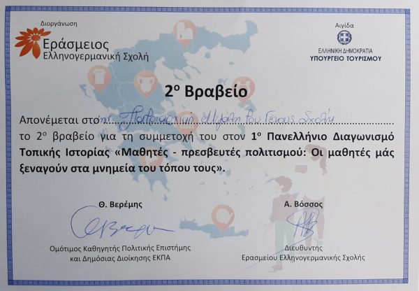 Το 2ο βραβείο έλαβε η μαθητική ομάδα της Πατριαρχικής Μεγάλης του Γένους Σχολής (ΠΜΓΣ) για τη συμμετοχή της στον 1ο Πανελλήνιο Μαθητικό Διαγωνισμό Τοπικής Ιστορίας “Μαθητές-Πρεσβευτές Πολιτισμού: Οι μαθητές μάς ξεναγούν στα μνημεία του τόπου τους”, που διοργάνωσε η Εράσμειος-Ελληνογερμανική Σχολή. Η εργασία των μαθητών της ΠΜΓΣ είχε τίτλο: “Παναγία Μουχλιώτισσα. Ήταν μια φορά και έναν καιρό μια όμορφη κυρά Πολίτισσα που την παντρέψανε στα ξένα δώδεκα χρόνων…”.