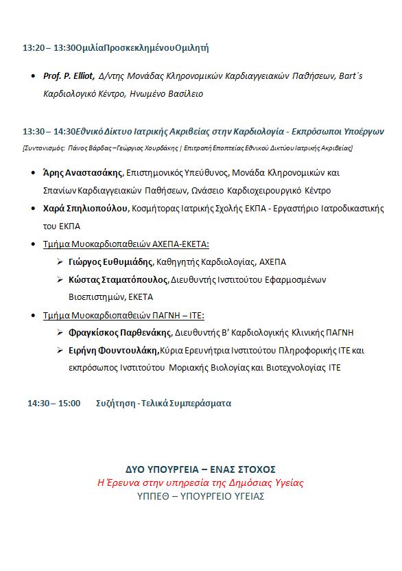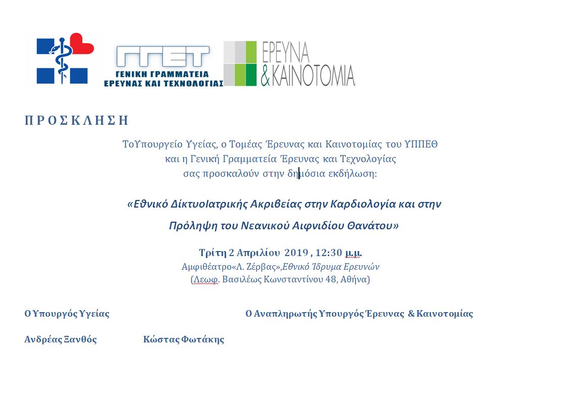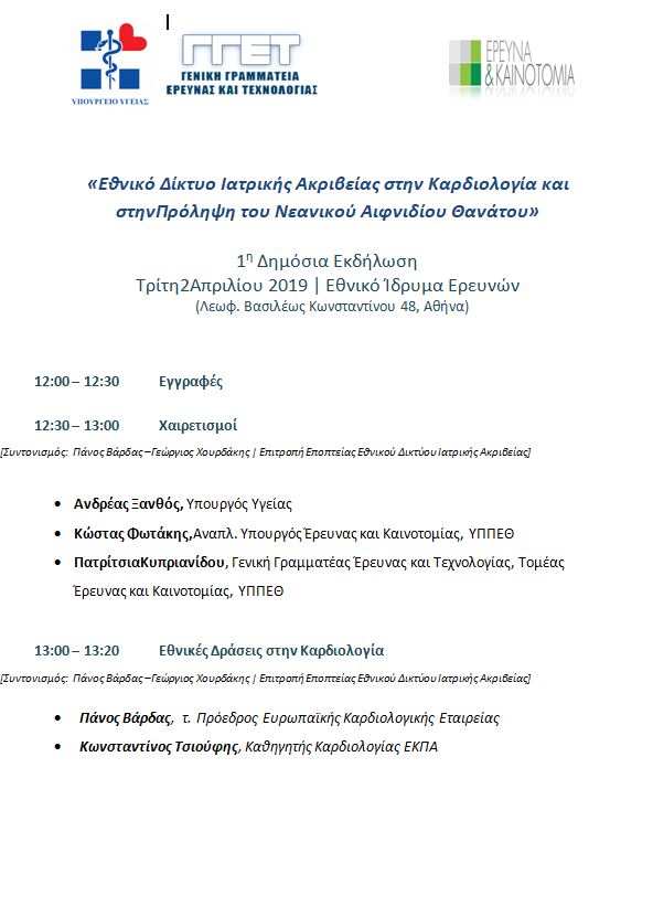 Την Τρίτη 2 Απριλίου 2019 και ώρα 12:30 μ.μ., θα πραγματοποιηθεί η 1η Δημόσια Εκδήλωση της Εμβληματικής Δράσης: «Εθνικό Δίκτυο Ιατρικής Ακριβείας στηνΚαρδιολογία και στην Πρόληψη του Νεανικού Αιφνιδίου Θανάτου», που συνδιοργανώνουν ο Τομέας Έρευνας & Καινοτομίας του ΥΠΠΕΘ, η ΓΓΕΤ και το Υπουργείο Υγείας.