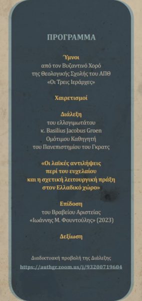 Στη Διάλεξη θα ομιλήσει ο Ομότιμος Καθηγητής του Πανεπιστημίου του Γκρατς κ. Basilius Jacobus Groen, με θέμα: «Οι λαϊκές αντιλήψεις περί του ευχελαίου και η σχετική λειτουργική πράξη στον Ελλαδικό χώρο».