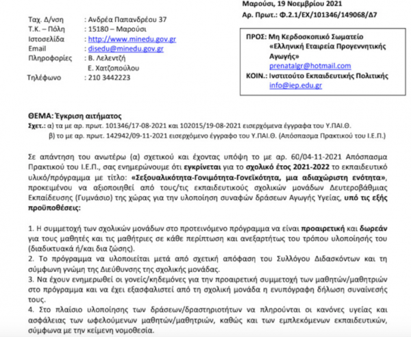 Υπενθυμίζεται ότι ο πρόεδρος του ΙΕΠ, μετά τον θόρυβο που προκλήθηκε στα Μέσα Ενημέρωσης αποφάσισε την ανάκληση της έγκρισης του εκπαιδευτικού Προγράμματος με την προβολή βίντεο στα σχολεία , για την Προγεννητική Αγωγή, του Μη Κερδοσκοπικού Σωματείου Ελληνική Εταιρεία Προγεννητικής Αγωγής.