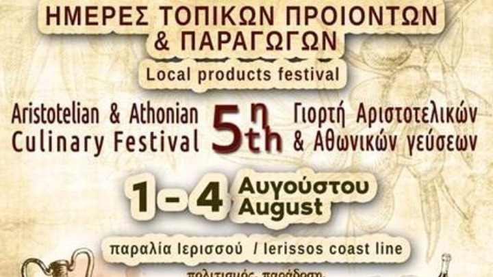 Γιορτή Αριστοτελικών και Αθωνικών Γεύσεων, θα πραγματοποιηθεί, από την 1η ως τις 4 Αυγούστου 2019, στην παραλία της Ιερισσού, στο πλαίσιο της έκθεσης «Ημέρες Τοπικών Προϊόντων και Παραγωγών».