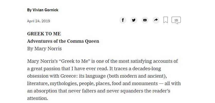 Η εφημερίδα New York Times φιλοξενεί μια εκτενέστατη παρουσίαση του νέου βιβλίου της γνωστής συγγραφέως και επιμελήτριας κειμένων του περιοδικού «New Yorker», Μαίρη Νόρις (Mary Norris), με τίτλο «Greek To Me».