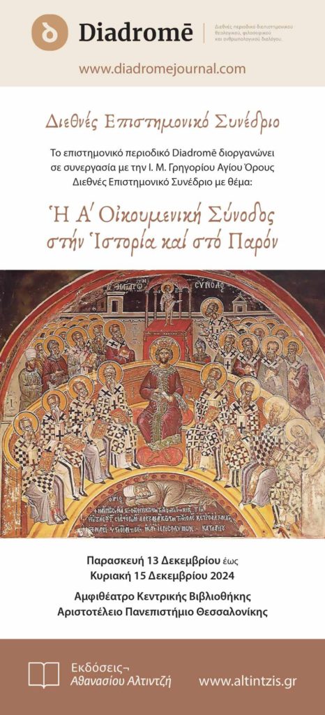 Το διεθνές επιστημονικό περιοδικό Diadrome σε συνεργασία με την Ιερά Μονή Γρηγορίου διοργανώνει Διεθνές Επιστημονικό Συνέδριο με θέμα: «Η Α’ Οικουμενική Σύνοδος στην Ιστορία και στο Παρόν».