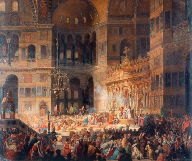 Ένας υπέροχος ρομαντικός πίνακας του “Gaspare Fossati” (1849) – Λάδι σε καμβά 53 x 42 εκ., που απεικονίζει την Αγία Σοφία, τον δωδέκατο αιώνα, κατά τη διάρκεια Ορθόδοξης Θείας Λειτουργίας με την Υψηλή παρουσία του Αυτοκράτορα Αλέξιου Α’ Κομνηνού.
