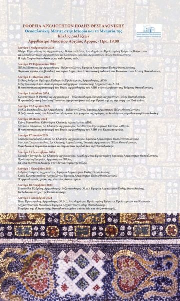 Τη Δευτέρα 05 Φεβρουαρίου 2024, στο μουσείο της Αρχαίας Αγοράς Θεσσαλονίκης, στις 19:00, θα πραγματοποιηθεί η πρώτη εκδήλωση του κύκλου διαλέξεων με τίτλο «Θεσσαλονίκη. Ματιές στην Ιστορία και τα Μνημεία της», που διοργανώνεται από την Εφορεία Αρχαιοτήτων Πόλης Θεσσαλονίκης.