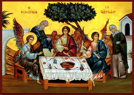 Στη Γένεση (18,1) ο Αβραάμ δέχτηκε την επίσκεψη τριών αγνώστων άνδρων . Ο Αβραάμ τους υποδέχτηκε με εγκαρδιότητα και αγάπη, παρ᾿ όλο που του ήταν άγνωστοι. Στη συνέχεια τους παρέθεσε πλούσιο τραπέζι. Κατά την συζήτηση οι άγνωστοι επισκέπτες ανήγγειλαν στον Αβραάμ ότι η γυναίκα του η Σάρρα θα αποκτήσει παιδί μέσα σ’ ένα χρόνο, όπως και έγινε.