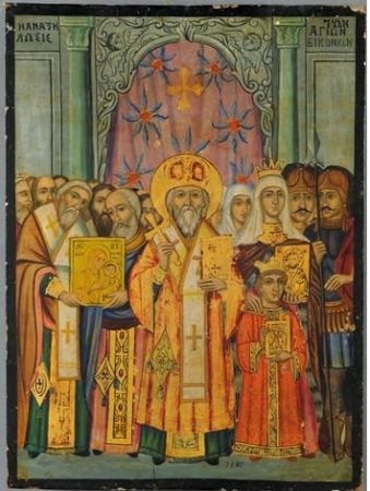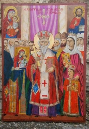 Εικ. 3. Νεόφυτος Ν. Ζωγράφος (αποδ.), 1905, Αναστήλωσης των εικόνων, ναός Παναγίας Δερύνεια.