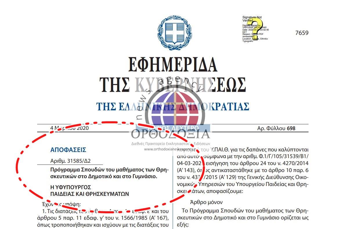 “Το μάθημα των Θρησκευτικών εντάσσεται στα υποχρεωτικά σχολικά μαθήματα, τα οποία διδάσκονται στο ελληνικό εκπαιδευτικό σύστημα. Η οργάνωση και η λειτουργία του θεμελιώνονται στο Σύνταγμα της Ελλάδας, στους νόμους του κράτους και τις αποφάσεις του ΕΔΔΑ. Βασική μορφωτική αποστολή του μαθήματος των Θρησκευτικών είναι η ανάπτυξη της θρησκευτικής συνείδησης των μαθητών και των μαθητριών” Αυτό αναφέρεται στο Φύλλο Εφημερίδας της Κυβερνήσεως που δημοσιεύτηκε χθες 4 Μαρτίου, αναφορικά με το Πρόγραμμα Σπουδών του μαθήματος των Θρησκευτικών στο Δημοτικό και στο Γυμνάσιο.. Και προστίθεται: “Επιπλέον, ο Ορθόδοξος πολιτισμός και η γλώσσα του αποτελούν αναπόσπαστο μέρος του πλαισίου της ελληνικής εκπαίδευσης, στην οποία ουσιαστικά συμβάλλουν, υποστηρίζοντας αποτελεσματικά τη θρησκευτική, γνωστική, πνευματική, κοινωνική, ηθική, ψυχολογική, αισθητική, και δημιουργική ανάπτυξη των ανθρώπων. Και ακριβώς για τον λόγο αυτό, το μάθημα των Θρησκευτικών εντάσσεται στον κανόνα των υποχρεωτικών σχολικών μαθημάτων του ελληνικού εκπαιδευτικού συστήματος. Λαμβάνοντας υπόψη τα παραπάνω, το μάθημα των Θρησκευτικών αποτελεί ένα μάθημα παιδείας και Ορθόδοξης Χριστιανικής παράδοσης”.