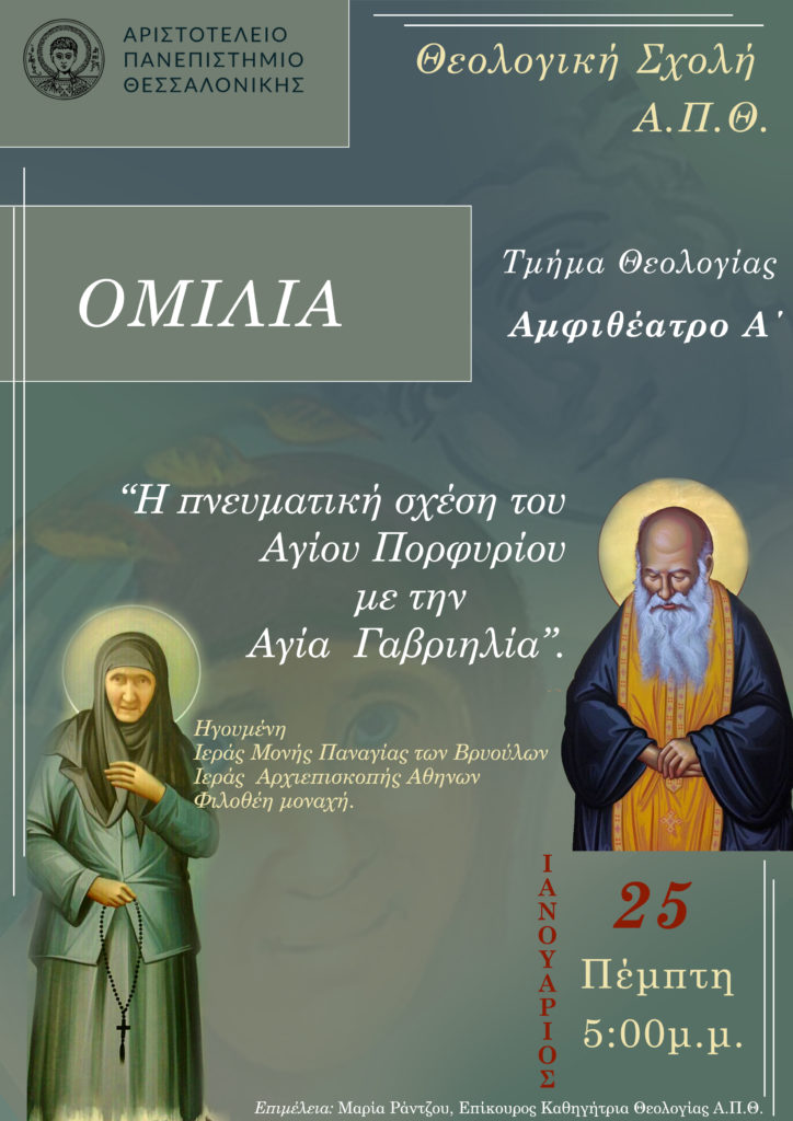 Ομιλία με θέμα «Η πνευματική σχέση του Αγίου Πορφυρίου με την Αγία Γαβριηλία» θα παραχωρήσει η Οσιολογιωτάτη Γερόντισσα Φιλοθέη, Ηγουμένη της Ιεράς Μονής Παναγίας Βρυούλων, την Πέμπτη 25 Ιανουαρίου 2024 στις 5:00 μ.μ. στο Αμφιθέατρο Α’ της Θεολογικής Σχολής του Α.Π.Θ..