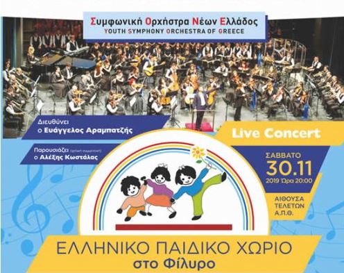 Το Ελληνικό Παιδικό Χωριό στο Φίλυρο διοργανώνει το Σάββατο 30 Νοεμβρίου 2019 και ώρα 20:00, στην Αίθουσα Τελετών του Αριστοτελείου Πανεπιστημίου Θεσσαλονίκης συναυλία Αγάπης με την Συμφωνική Ορχήστρα Νέων Ελλάδος.